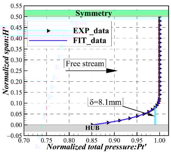 The boundary conditions were defined according to the experimental conditions. The average back pressure at the outlet was set to atmospheric value, and the solid surfaces were set to adiabatic and non-slip walls. The total temperature was 320 K at the inlet, where the total pressure was adjusted to maintain an inlet Mach number of 0.7. The inlet boundary layer was measured by the total pressure boundary layer probe and normalized by the maximum value. The thickness of the boundary layer () was 8.1 mm, as shown in Figure 7. The distribution of inlet normalized total pressure was fitted as Equation (7), and its R-square was 0.9999: