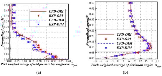 Pitch weighted average of performance parameters along the spanwise direction (DIM represents the case of ). (a) Total pressure loss coefficient; (b) deviation angle.
