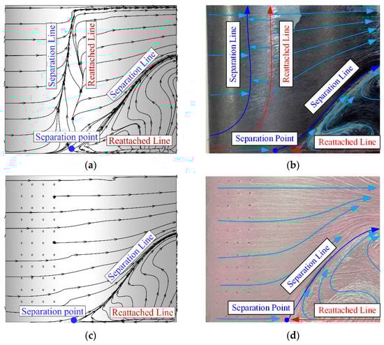 Limiting streamline on the suction surface of numerical and experimental results (DIM represents the case of ). (a) CFD-ORI; (b) EXP-ORI; (c) CFD-DIM; (d) EXP-DIM.