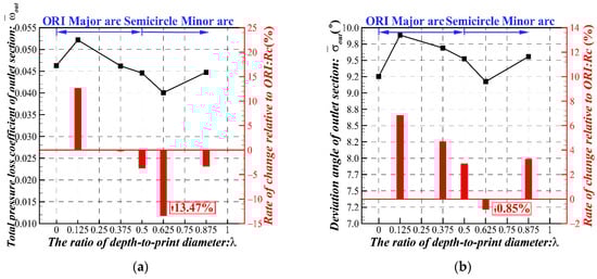A comparative analysis of the performance of the dimpled cascades and the prototype scheme (ORI), which is the main reference for evaluating the dimpled cascades, is carried out in this section. The evaluation is based on two parameters, the total pressure loss coefficient () and the deviation angle () of the outlet section, which correspond to the characteristics of efficiency and compression, respectively, as shown in Figure 10. The histogram in Figure 10 represents the relative change (Rc) in parameters between the dimpled cascade and the original cascade. The Rc is defined as: