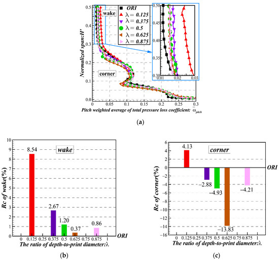 Compared with the overall change in outlet, the contribution of each region gives more intuitive data to study the impact of the dimples. Figure 11a shows the stacking of the pitch weighted average of the total pressure loss coefficient along the spanwise direction. In order to quantify the influence of the dimples, the area above was defined as the wake area, and the rest represents the corner area. It can be seen from the partially enlarged figure of the wake region that the total pressure loss coefficient increases when the blade is dimpled. The loss increases significantly in the dimpled cascade with the inferior arc, and it is similar to the secondary level in the dimpled cascade with the semicircle arc and the superior arc. It should be pointed out that the loss of the wake region in the dimpled cascade has a wavy trend. From the loss distribution at the corner region, it was observed that the value of the inferior arc dimpled cascade fluctuated near the ORI, and the loss expressed by the distribution curve of was significantly less than that of ORI.