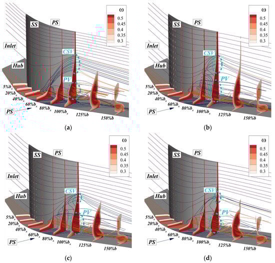 The performance of the cascade is an overall reflection of the flow field, and further analysis of the corresponding flow characteristics is helpful to grasp the mechanism. Figure 12 is a 3D streamline near the suction surface and the end wall, which generally means the low-energy fluid. The S3 sections were established in the passage along the axial direction to reflect the development of flow loss. Compared with the loss development on the upper part of the blade, the INF dimples (, ) rolled the high-loss area into a wavy shape, and it thus became larger. As shown in Figure 12b, the range of high-loss contour at extends in the spanwise direction, which explains the increased wake loss of the dimpled cascades. This effect could not be identified well when is greater than 0.375, and further discussion is conducted with boundary layer.