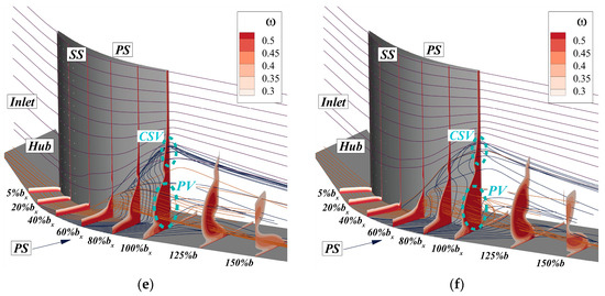 Three-dimensional flow near the suction surface and the end wall. (a) ORI; (b) ; (c) ; (d) ; (e) ; (f) .