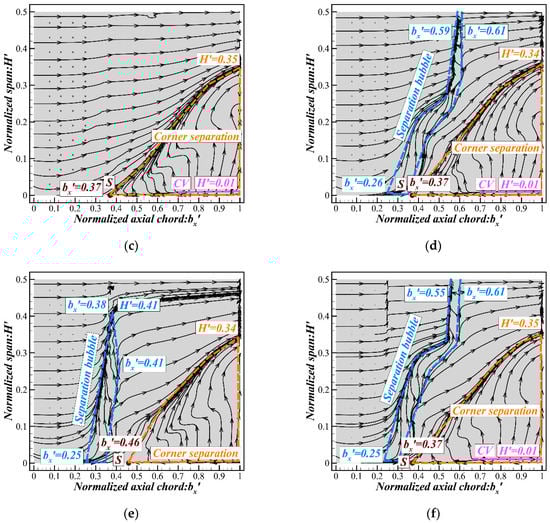 Figure 13 shows the limiting streamline on the suction surface, which mainly shows three flow structures, including the laminar separation bubble (LSB), corner separation and the wall corner vortex (CV) inside. The CV was weakened by the concave surface, which could confirm that the height of the projection of CV on the suction surface was reduced from 0.02 to 0.01, even disappearing at . The inferior arc schemes (, 0.375) eliminated LSB. After , the LSB was weakened but still existed, and the weakening begins from the middle part of blade. The LSB with could not cover the whole blade. The flow in the corner separation of the dimpled blade was improved as a whole. As shown in Figure 13e, the separation starting point S of was pushed far to the position of , compared with of ORI in Figure 13a. The projected height of the corner separation of was reduced to the level of , whereas it was in the ORI. This value increased to in , which may be due to extension of the backflow impacted by the higher velocity inflows. Overall, the characteristics of the closed corner separation of dimpled blades were degraded and its range was reduced.