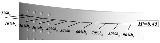 Due to the weakening or elimination of LSB, the flow blockage in the middle of the blade was reduced, which does not match with the increase in the wake loss of the dimpled cascade, and it needs further explanation. The boundary layer is a thin layer with sharp changes in the stress near the wall, which plays a decisive role in the flow field. According to the ten local vertical lines established on the suction surface at and the range of to in Figure 14, the boundary layer on the suction surface can be extracted.