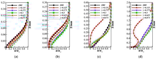 Figure 15 shows the boundary layer of on the blade, and four axial positions (, , , ) are shown to clarify the influence of the dimples. The boundary layer shape before was not full enough, indicating that it is a laminar boundary layer. The dimpled surface increased the flow velocity near the wall, making the boundary layer thinner, as shown in Figure 15a. This phenomenon can be explained by the wall slip effect described by Li []. The semi-circular dimple () obtained the most favorable near-wall velocity due to slip effect. Combined with Figure 13b, retains a vortex at , making it produce a negative velocity factor like the ORI. The reverse velocity of and appears at in Figure 15c, indicating that the separation bubbles in Figure 13d,f are detected. The boundary layers of and developed obviously beyond , which was caused by the disturbance of the vortexes generated by the dimples, as shown in the wavelike high-loss region in Figure 12b,c. Overall, the dimples with an inferior arc (, ) could eliminate the LSB while introducing additional vortices, which still leads to the deterioration of the boundary layer. The dimples with a semicircular arc () and a superior arc (, ) could delay the separation of LSB and slightly reduce the thickness of the boundary layer.