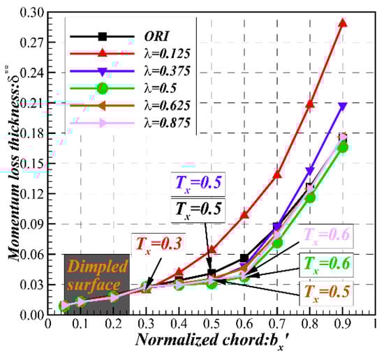 The boundary layer momentum thickness (, defined by Equation (5)) of each position in Figure 14 is drawn to Figure 16. The momentum loss is divided into two stages of smooth and rapid development. The sudden rising point of is about at , which is more forward than the position of the ORI, meaning the transition of the boundary layer occurred in advance. The further development of the turbulence boundary layer caused a great momentum loss. The location of the transition point () of the remaining scheme is equivalent to or more backward than that of the ORI, indicating that the disturbance of these dimples makes the boundary layer of the blade maintain a low loss state, due to the wall slip effect. However, the slope of the curve of momentum loss thickness becomes large once it passes over the transition starting point, which is related to the high-turbulence outflow from the dimples, which will be discussed in Section 4.3.