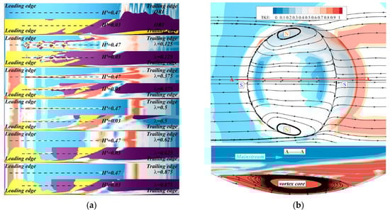 Figure 17a shows the normalized TKE contours and axial vorticity iso-surfaces of different schemes at and . The TKE normalized by the scope of values ranging from 0 to 1 near the suction surface (SS) is represented by a blue-red colored contour map. Meanwhile, the two vorticity iso-surfaces () restricted by the selected-value around the suction surface, yellow representing and purple representing −, are also plotted in Figure 17a. Secondary vortex pairs are generated inside the dimple and outward at the dimple’s diagonal direction, which is reinforced by downstream outflows (especially ). These vortex-passed zones show the characteristics of high TKE and continue to exert impact on the downstream locations. This phenomenon can be confirmed by an experimental investigation by Zhou et al. [] on the characteristics of turbulent boundary layer flows over a dimple with . Note that with the increase in , the high TKE region near the trailing edge becomes smaller and moves backward, which corresponds to the position where increments occur sharply in Figure 16. At the region, the dimples weaken the vorticity near the end wall, which lighten the corner secondary flow.