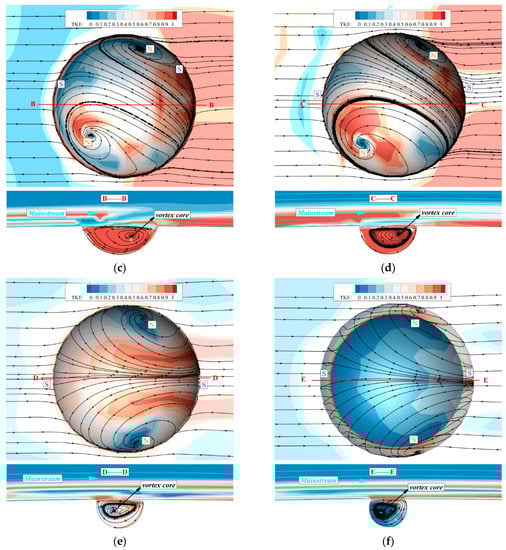 Figure 17b–f are the normalized TKE and streamline in the dimple at the front of , which show the limiting streamline and 2D streamline inside and near it. Three regimes (diffuser–confuser flow, horseshoe vortex and tornado-like vortex) exist within the dimples as the flow velocity or the depth of dimple increases, as mentioned in []. Tay [] refined these regimes into five flow stages through dye flow visualization. A significant recirculation zone appears in the anterior part of the spherical depression, and its vortex core is suppressed at the bottom of the dimple, as shown in Figure 17b. This behavior is consistent with stage Ⅱ discovered in [], which was also defined as diffuser–confuser flow in []. This further confirms that the flow in the dimple with h/2R < 0.1 is characterized by the diffuser–confuser flow summarized and analyzed by Kovalenko, and the corresponding h/2R = 0.06 for is shown in Figure 17b. The limiting lines in Figure 17c,d show that there is a pair of asymmetric vortices (one of which dominates) in the sag body, which is coherent with stage Ⅳ of the experiment in [], or the tornado-like vortex in []. The attachment point (N) of the tornado vortex is close to the front edge of the depression, and its axis is struck near the back edge and raised to the position of the bowl. The profile shows that the axis of the tornado vortex becomes very distorted in space, usually unstable. Figure 17e,f shows a pair of symmetrical horseshoe vortices attached downstream, and their axis is bending upstream. With the increase in velocity, the horseshoe vortex pair appears before the tornado pattern in [], which indicates that the development of flow regimes depends not only on the flow velocity, but also on the relative dimple depth. These relationships are given in Table 4.