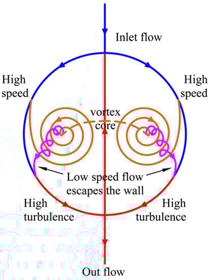 Each shape of the dimple drags two high TKE region-formed “braids”, distributed about the axis symmetrically on the margin. For tornado-type flows, the “braids” are almost covered with downstream plates, with the relatively uppermost TKE intensity. It can be seen from Figure 17a that although the dimples of and are much smaller than those of , the “braids” extend even farther. The TKE caused by the horseshoe vortex within the dimples of the superior arc shape is slight but closer to the central axis.