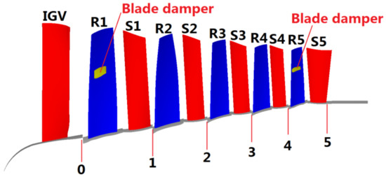 The research object of this paper was a five-stage axial low-pressure compressor in service, as shown in Figure 1. The numerical calculation model of the low-pressure compressor included an inlet rectifier cone, inlet guide vane (IGV), rotor blades (Ri), and stator blades (Si), in which, R1 and R5 were equipped with blade dampers. At the design rotational speed, the flow coefficient was 0.66, and the inlet Mach number of R1 was 1.20. Some design parameters of the compressor at the design rotational speed are shown in Table 1.