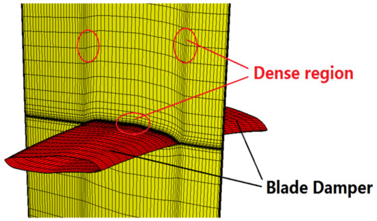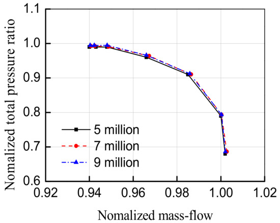 The mesh with a single passage for numerical calculations was generated by NUMECA/Autogrid5. An O4H topology was used for each blade row, and a butterfly grid was applied for the rotor tip clearance. Since there is a damper in the position of R1 and R5 in the blade, the grid around the damper was densified, as shown in Figure 2. The verification of the computational grid independence is shown in Figure 3. The total number of grids for the five-stage compressor reached 5 million, which was verified by grid independence. When the number of grids increases to 7 million and 9 million, its performance curves (mass flow rate to pressure ratio) are almost consistent with those of 5 million grids. Therefore, the number of 5 million grids was selected for numerical simulations. All grids were densified near the wall, and the first grid distance was 0.005 mm to ensure Y+ < 5. Figure 4 gives the Y+ distributions for all blade walls. It can be seen that the maximum Y+ is less than 5, which is enough to meet the calculation requirement.