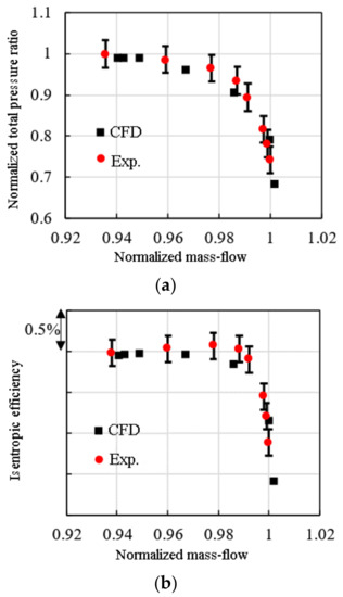 Comparison of overall performance at design rotational speed between experimental measurement and numerical simulation. (a) Total pressure ratio versus mass flow, (b) Isentropic efficiency versus mass flow.