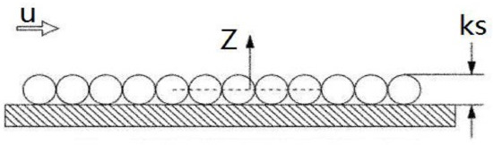 However, since the evaluation parameters of surface roughness are not determined by amplitude parameters, the roughness Ra defined in engineering cannot fully characterize the surface roughness. Schlichting [25] first proposed the equivalent gravel roughness Ks to characterize the surface roughness. Under the condition of uniform flow, the actual rough surface is equivalent to a surface covered by a layer of uniform spherical gravel with a diameter of Ks. The definition diagram of equivalent gravel roughness is shown in Figure 6.
