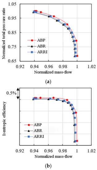 Figure 7 presents the overall performance curves of the compressor at the design speed with the variation in blade surface roughness. The three curves from top to bottom represent the total performance curves of all blades polished (ABP), all blades roughened (ABR), and all rotors roughened individually (ARRI), respectively. It is observed that, when all blades become rough, the blocking flow, peak total pressure ratio, and peak total efficiency are reduced. Compared with the situation of all blades polished, the blocking mass flow decreases by approximately 0.3%, and the peak total efficiency decreases by approximately 0.4%. However, the stable working range changes little, which is consistent with the conclusion of Chen et al. [19] in the roughness study for NASA stage 35. Therefore, the blade roughness has little effect on the stable working margin of the compressor. When all of the rotor blades become rough, the compressor performance curve is close to the case with all rough blades, demonstrating that the change in stator blade surface roughness has little impact on the compressor performance. Thus, the leading factor of performance degradation is the increase in rotor blade surface roughness, which is consistent with the impact of roughness on the performance of single-stage compressors in the open literature [12,13,14,19].