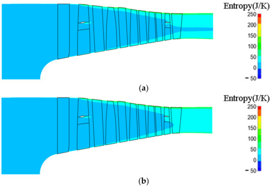 Figure 8 gives the comparison of the distribution of entropy under the peak total efficiency condition when the blade surface roughness changes. By comparing the pitch-averaged flow field when all blades are roughened and polished, it can be seen that the entropy generation in the middle of the fifth stage blade is larger. It is preliminarily concluded that, when all of the blade surfaces become rough, the change in roughness has a relatively small impact on the performance of the front stage, and the change in roughness has a great impact on the performance of the fifth stage.
