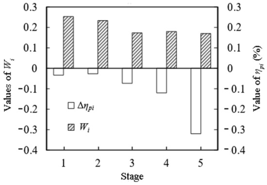 The histogram of the weight variable value and efficiency decline value of each compressor stage is given in Figure 9. It can be seen that the quantitative analysis clearly quantifies the influence of blade surface roughness at all stages on the performance of the whole compressor. Specifically, the weight variable values of the first stage and the second stage are higher than those of the latter three stages. However, from the degree of efficiency decline, it can be observed that the latter three stages contribute the most to the efficiency decline of the whole compressor, especially the fifth stage, with the largest proportion of efficiency decline of up to 0.32%.