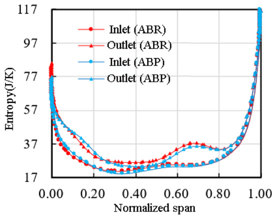 In order to explore the mechanism of the change in blade surface roughness affecting the overall performance, a flow detail analysis is carried out below. Since the decline in the fifth stage performance contributes the most to the decline in the overall performance, the flow field of the fifth stage is mainly analyzed here. Figure 10 shows the entropy generation distribution along the span of the fifth stage at the inlet and outlet for different roughness conditions under the peak total efficiency condition. The red curve represents the entropy distribution of the fifth stage with all rough blades, and the blue curve refers to the entropy distribution of the fifth stage with all polished blades. When the span is determined, the difference between the entropy at the outlet and inlet of the fifth stage is the entropy generation of the fifth stage at the span. It indicates that, in the region below a 20% span, the entropy generation in the blade rough state is smaller than that in the polishing state, indicating that the flow loss near the fifth stage root is smaller after the blade surface becomes rough. Moreover, in the range of a 30% to 70% span, the entropy generation in the blade rough state is significantly larger than that in the polishing state, which reveals that the flow loss near the middle of the fifth stage increases significantly after the blade surface becomes rough.