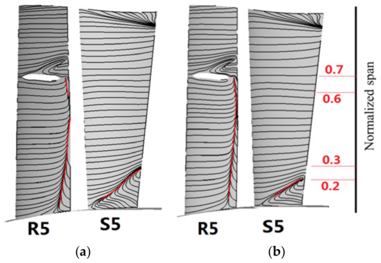 The limit streamlines of the suction surface of the fifth stage for different roughness conditions under the peak total efficiency condition are displayed in Figure 11. Among them, the red limit streamlines donate the boundary layer separation lines on the surface. The limit streamlines on the rotor suction surface imply that, in the polishing state, the separation line extends from the blade root to the vicinity of the middle of the blade, then reattaches and extends to the lower end of the damper. However, once the blade surface becomes rough, the axial length of the recirculation zone caused by the separation near the blade root decreases, and the separation line extends from the blade root to the lower end of the damper without disconnection in the middle of the blade. Therefore, the recirculation zone near the middle of the blade is slightly larger than that in the polished state. From the change in the limit streamline on the rotor suction surface, it is seen that, as the blade surface roughness increases, the recirculation zone at the blade root of the stator suction surface decreases significantly, and the spanwise height of the recirculation zone decreases from the original 30% span to a 20% span.