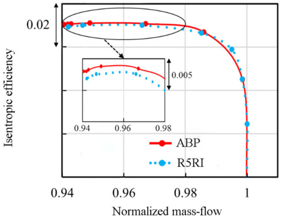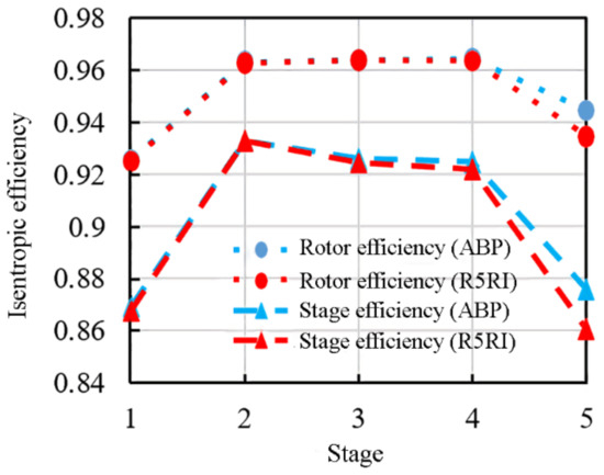 Figure 12 compares the flow efficiency characteristics of the compressor when the fifth stage rotor is roughened alone and when all blades are polished. The mass flow in the figure is normalized by the experimentally measured blocking flow. Moreover, the red and blue curves represent the flow efficiency characteristic curves of ABP and R5 roughened individually (R5RI), respectively. It can be seen from the zoomed-in view that, when the rotors of the fifth stage are roughened, the peak total efficiency of the compressor decreases compared with when all blades are polished.