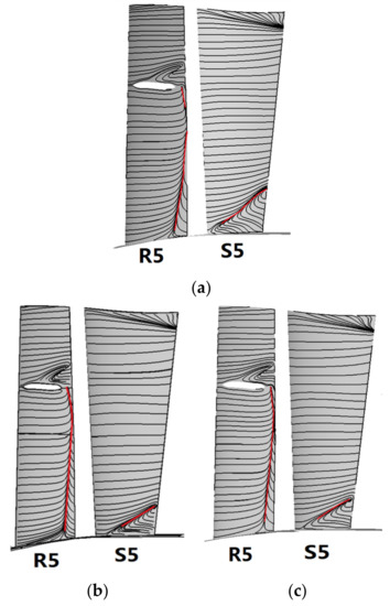 Limit streamline distribution of blade suction surface of fifth stage under peak efficiency conditions. (a) ABP, (b) R5RI, (c) ABR.