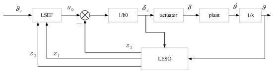 where is input, is control gain. f refers to the generalized disturbance, which contains the internal and external uncertainty of the model, that is , and d is external uncertainty disturbance. We selected the following state variables: . Then, is the expansion state containing the disturbance. The plant in (3) is written in the form of the following extended state equation: