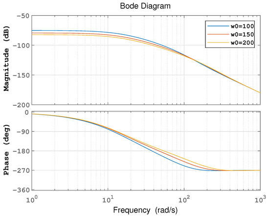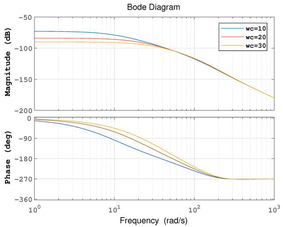 It can be obtained from (26) that the disturbance rejection characteristic of the system is related to the disturbance terms, which are the bandwidth parameters and . When , the frequency characteristic curve of the disturbance term can be obtained as shown in Figure 2. When , the frequency characteristic curve of the disturbance term can be obtained as shown in Figure 3. From Figure 2 and Figure 3, within a certain range, the amplitude of the system decreases with the increase in and , that is, the disturbance gain decreases, and the system’s ability to suppress disturbance is enhanced.