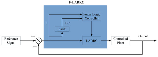 For LADRC, the key to tune parameters is to select controller gain and observer gain. Through the structural analysis of (23), we can find that the second order LADRC consists of the following three parts: proportion , differentiation and disturbance estimation compensation . To sum up the above analysis, the parameters to be tuned are and , that is, the bandwidth of LSEF and LESO respectively. determines the tracking performance of the control system and determines the system’s ability to compensate for errors. can be set for most common engineering objects [31]. Therefore, choosing an appropriate bandwidth of LSEF becomes the key to parameter tuning. In this section, the fuzzy logic control principle is used to tune the parameter online, and the adaptive ability of the fuzzy control is used to achieve the purpose of automatic tuning. We selected the tracking error E of the pitch angle and the error rate of change as the input of the fuzzy control system, and the bandwidth of LSEF as the output. The schematic diagram of the combination of the fuzzy and LADRC control system is shown in Figure 4.