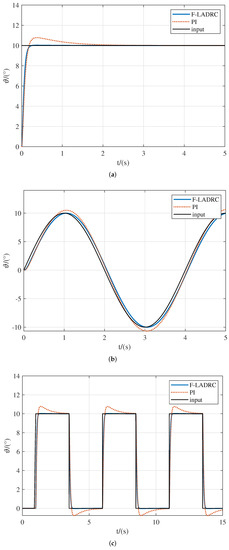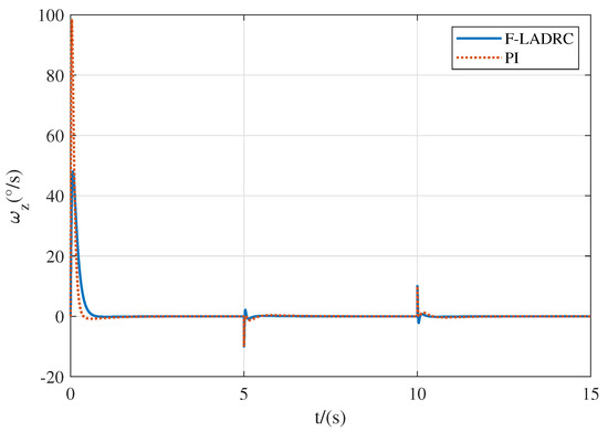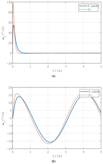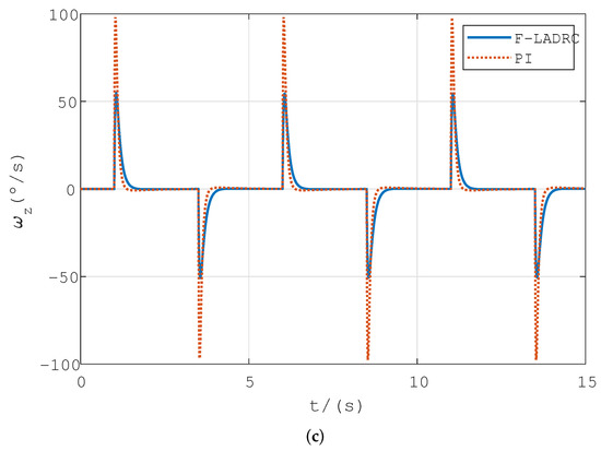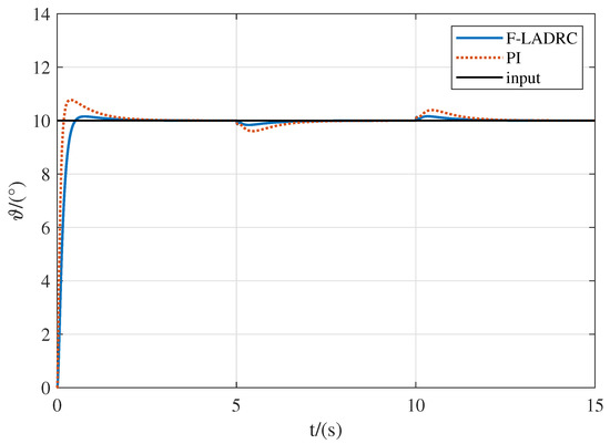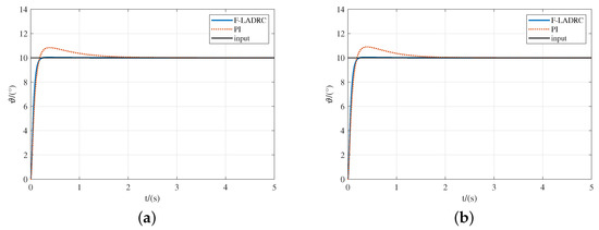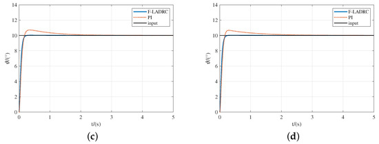 PI controller is widely used in flight controller design [38,39,40]. In this paper, we selected the PI controller to compare with F-LADRC. The parameters of the traditional PI controller were determined using the standard coefficient method [41,42,43]. The parameters of the PI controller were as follows: .
