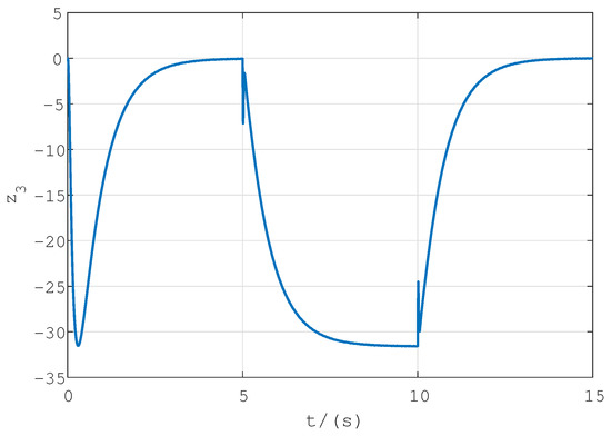 that is, if there is step disturbance in the system, the steady state error output response is 0, and LADRC has a good ability to suppress external disturbances. It can be seen from (30) that with the increase in the bandwidth and , the decay speed of increases, and the recovery time of the system shortens after disturbance.