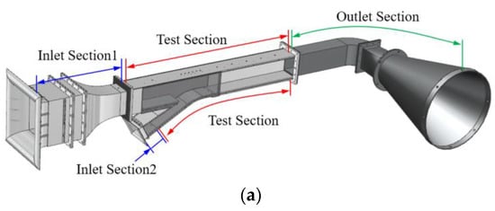 As shown in Figure 16, the VABI test facility was set up comprising three parts: the inlet section, the test section, and the outlet section. The test section was 80 mm in width and 100 mm in height, corresponding to the Reynolds number of 3.0 × 105. There were two inlets for the test facility: The ambient air directly flowed into the inner bypass (Inlet Section2), while an orifice control valve was placed at the inlet of the outer bypass (Inlet Section1) to control the bypass total pressure ratio. A ventilator was installed after the outlet duct to regulate the backpressure at the outlet of the total bypass. To investigate the impact of the VABI opening condition, a retractable diaphragm valve was installed at the juncture of the bypass ducts, while the inner bypass duct was designed to be replaceable so that the injection angle could be conveniently changed. The variation range of the VABI is demonstrated in Table 4, with the maximum Mach number approaching 0.4.