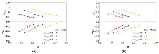 As shown in Figure 1, the mixed flow downstream of the VABI undergoes another confluence process in front of the nozzle, so it is necessary to accurately calculate the total pressure loss of the mixing flow to determine the regulation rules of the aft VABI. The comparison of VABI loss characteristics between the CFD results and the model prediction results are given in Figure 11, in which KAC and KBC are the loss coefficient of the two bypass branches, respectively. The definition of the loss coefficient is given in Equation (22), which is widely used for evaluating the flow loss for conjecture flows [22,23,24].