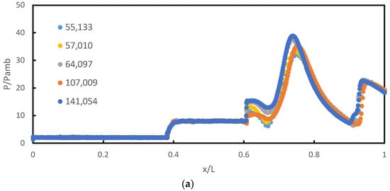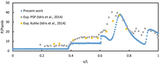 The computational findings produced here are quite similar to the experimental data in [], although a discrepancy was observed at the compression ramp. The error in the experiment was and the value from all pressure transducers was []. The compression ramp in the front of the isolator had an unstructured mesh, and this could affect the numerical results. The numerical results were slightly underpredicted compared to the experiments owing to the boundary layer effects at the compression ramp. However, the numerical results inside the isolator are well-predicted. This study is primarily focused on the isolator. Therefore, sufficient data can be obtained from the current numerical analysis.