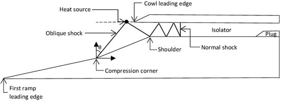 Macheret et al. [] were among the earliest to explore the impact of putting a source of heat in a fast-moving vehicle inlet. As the heated zone forced the stream to streamline through the hypersonic inlet, the authors invented the phrase “virtual cowl”. According to their findings, when the Mach number was below the intended amount, the air velocity of the fluid in the scramjet inlet increased. The researchers subsequently determined the ideal location for the source of heat to reduce air leakage. Kremeyer et al. [] discovered a strategy to increase high-speed vehicle intake efficiencies by positioning a source of energy upstream on the inlet. Similarly, Russell et al. [] demonstrated that sources of heat might be used to reduce dispersion and increase the performance of an internal combustion engine in a high-speed vehicle.