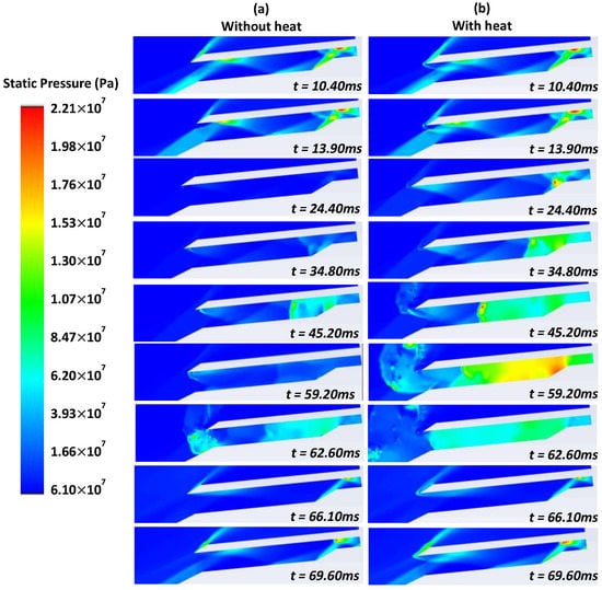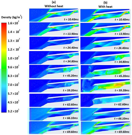 The intake flow rate increased, and the detachment shock impacted the cowl tip at t = 10.40 ms. The separation flow at the intake decreased at t = 13.90 ms. The space at the throat was at its narrowest at t = 45.20 ms, at which point the detachment shock had fully reached the intake. Near the shoulder, the separating bubble on the ramp and its isolator floor intersected. After the addition of a source of heat, the shockwave was reflected within the isolator, as seen in Figure 5b, but outside the isolator without a source of heat (Figure 5a), the flow behaviour was affected, and hence, the function of the intake was distorted. Furthermore, as the detachment shock on the shoulder travelled upstream at t = 59.20 ms, a huge barrier formed at the inlet’s opening (Figure 5b). At t = 62.60 ms, the detachment shock was released from the internal compression component, and the whole flow through the intake became practically subsonic. This did not happen in Figure 5b due to shockwaves originating from the heat source, which helped to keep the shockwave inside the isolator. The inlet fluid flow increased at t = 66.10 ms, and a subsequent upstream-moving shock arose in the inlet’s back area. When the separation shock hit the cowl’s edge, a second oscillatory stage occurred. Within the inlet, the separated flow returned. During t = 69.60 ms, the flow patterns were nearly identical to those at t = 10.40 ms. The generation and development of the upstream-moving shock throughout the inlet had a substantial impact throughout the cycle according to a previous study []. The density contour appeared to behave similarly to the Schlieren imaging approach described by [].