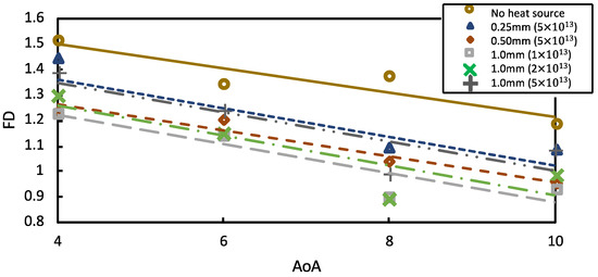 The FD value was the highest when the heat source was not employed at the intake. This study replicated various AoAs from AoA = 4° to 10°. This suggests that the current intake will experience flow turbulence or substantial flow distortions for these ranges of angles of attack. It was observed that at AoA = 4° and AoA = 6°, the FD was enhanced by 18.8% and 15.2%, respectively, with a 1.0 mm diameter, 1 × 1013 Wm−3 heat source. At AoA = 8°, the FD improved by 15.1% with a 1.0 mm diameter, 2 × 1013 Wm−3 heat source, whereas at AoA = 10°, the FD showed an improvement of 21.55% with a 1.0 mm diameter, 1 × 1013 Wm−3 heat source. Thus, the FD in the steady-state conditions was influenced by the heat source energy.