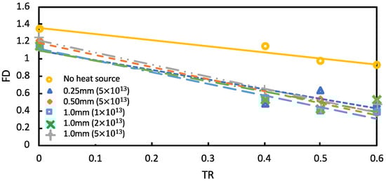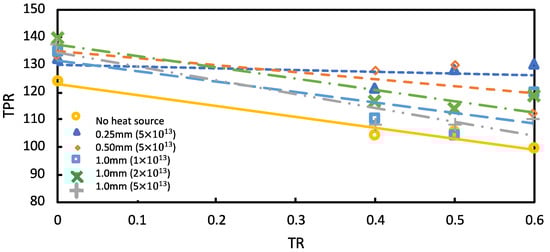 Figure 10 reveals that, during transient-state circumstances, TR = 0.4 and TR = 0.5 improved by 22.3% and 22.8%, respectively, for a diameter of 0.5 mm and heat source of 5 × 1013 Wm−3. At TR = 0.6, the greatest TPR transient-state conditions were 24.6% for a 0.25 mm diameter, 5 × 1013 Wm−3 heat source. According to the observation results of Figure 10, the TPR during the transient-state settings was influenced by the size of the heat source.