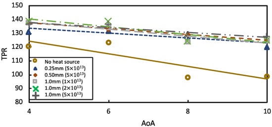 Figure 9 shows that AoA = 4° and AoA = 6° both helped raise the TPR by more than 14.5% and 12.8%, respectively, for a 1.0 mm diameter, 2 × 1013 Wm−3 heat source. At AoA = 8°, the 0.5 mm diameter, 5 × 1013 Wm−3 heat source had a maximum TPR of 31.4%, whereas AoA = 10° showed a 29.1% improvement with a 1.0 mm diameter, 5 × 1013 Wm−3 heat source. Figure 9 shows the fluctuation of the TPR on AoAs with varying heat source energies and diameters under steady-state conditions, for which the heat source energy was more significant.