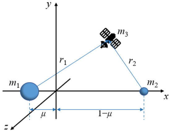 Ganymede has an orbital eccentricity of 0.0013, which is very small; this means that the CR3BP can be used to provide an approximation of Jupiter–Ganymede dynamics. The dynamical model in the CR3BP consists of three bodies, with masses m1, m2, and m3. The third body m3 is massless compared to the two primaries, m1 and m2, without the loss of generality, assuming m1 > m2. The CR3BP assumes that two primary bodies are moving in a circular orbit about their common barycenter and that the motion of m3 is dominated by the gravitational attractions of them. Conventionally, the system is normalized, such that both the distance between m1 and m2, LU, and the mean motion of the primaries, WU, are constant and equal to unity, which means that the orbital period of m2 is 2π time units. In addition, let μ denote the ratio of the mass of the secondary body to the total mass, so that the first and secondary primaries’ masses are nondimensional and equal to 1 − μ and μ, respectively. The motion of the third body is then described using a normalized dimensionless synodic system. The synodic system is a rotating coordinate system, with its origin at the barycenter of the primaries, an x-axis directed from the origin in a direction away from the primary, a y-axis aligned with the direction of the velocity vector of the secondary, and a z-axis completing the right-handed coordinate system, as depicted in Figure 1. In this rotating frame, the equations of motion for the third body are written thus, as seen in [25]: