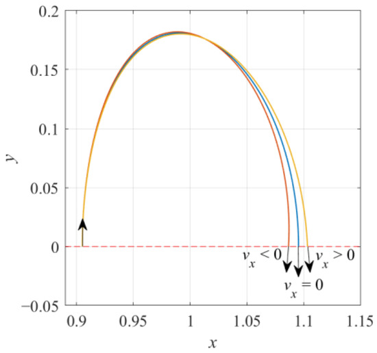 Since only one variable needs to be adjusted, we can use dichotomy to establish a sufficiently precise initial value. Generally, we choose 0.1 or 0.01 as the length of the dichotomy interval for the dimensionless variable vy0 after normalization. Unless otherwise stated, the following calculations and drawings are carried out in the normalized coordinate system. Qualitatively, when the probe passes through the plane y = 0, the centripetal or centrifugal trend of the probe can be determined by judging the direction of the velocity vector (or the direction of vx), as shown in Figure 2, where the middle orbital is perpendicular to the x-axis, the left orbital has vx < 0, and the right orbital has vx > 0. Then, the initial velocity value is corrected by dichotomy. This method has a high convergence speed for calculating two-dimensional periodic orbits with good symmetry, but its disadvantages are that the convergence range is small, the input guess initial value cannot differ too much from the “exact value”, and the length of the dichotomy interval cannot be too large. When the problem is extended to three dimensions, the dichotomy method fails. At that time, a shooting correction method for the state transition matrix is still needed.