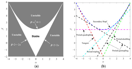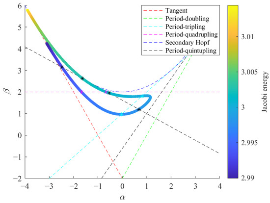 In this technique, four nontrivial eigenvalues of the monodromy matrix for each family member are fully defined by the scalars α and β. The Broucke stability diagram in Figure 3a offers insight into the orbital stability in the α-β plane. A more informative stability diagram [34], based on the Broucke stability diagram, is constructed as shown in Figure 3b. Each periodic orbit may be represented by a point in Figure 3b; thus, a curve that illustrates a family of periodic orbits can be drawn. Bifurcations occur when this curve intersects those in Figure 3b and bifurcation points, namely, intersections are found. In Table 1, bifurcation types are described with the equations of curves in Figure 3b.