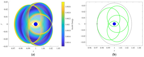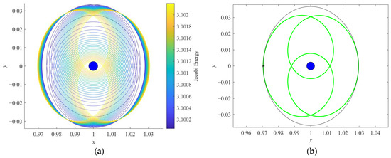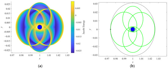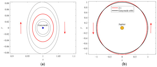 A resonant DRO (2:1) and its direction of motion in the synodic frame and in the Jupiter-centered inertial frame are shown in red in subgraphs (a) and (b) of Figure 4, respectively. It is evident that the DRO around the secondary body is in a direction opposite to the direction of the secondary body orbiting around the barycenter when viewed in the rotating frame, and orbits in a prograde direction following the secondary body when viewed in the inertial frame; hence, it is called a distant retrograde orbit (DRO).