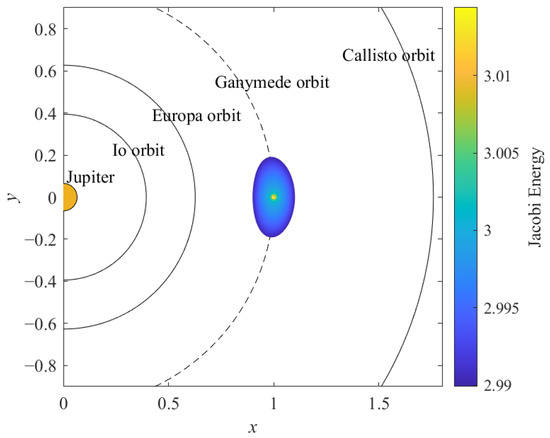 Distant retrograde orbits (DROs) were originally studied by Hénon in his extensive exploration of the whole solution of the planar restricted three-body problem [1]. These orbits are becoming an increasingly popular target for deep space exploration with the Asteroid Redirect Robotic Mission proposed by NASA, which plans to capture an asteroid and then redirect it into a stable orbit, perhaps a DRO around the Moon, as a testbed for potential exploration [2,3]. As deep space exploration increases, several near-time missions have taken the Jupiter system as their target. The Europa Clipper Mission and the Jupiter Icy Moons Explorer (JUICE) mission are expected to be launched no later than 2025 by NASA and ESA, respectively [4,5]. The JAXA’s MMX mission will collect observations of Phobos from stable retrograde relative trajectories and aims to reveal the origin of the Martian moons, enhance our comprehension of the Martian system, and pave the way for the human exploration of Mars [6,7]. In order to investigate the application of DROs to Jupiter system exploration, this work will be carried out on the Jupiter–Ganymede system.