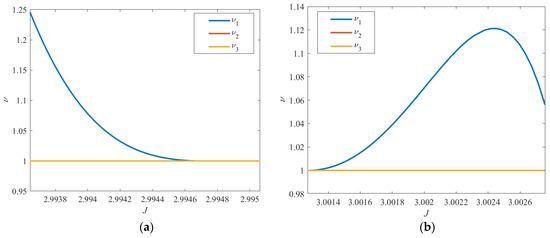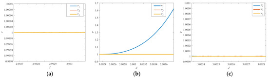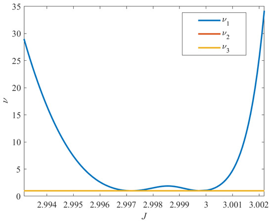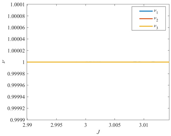 Considering the positions and perturbations of the other three Galilean moons, the DRO family whose initial position x0 covers from 0.9 to 0.995 with an interval of 0.0005 is calculated, as shown in Figure 5. Each color of orbit indicates each Jacobi constant value, as specified by the color bar on the right. Jupiter and the four Galilean moons’ orbits around Jupiter are drawn to real proportion. It is apparent that the DROs orbiting closer to Ganymede possess higher Jacobin constant values, which can be as high as the Jacobin constant values for L1 and L2. Figure 6 shows that the three stability indices of DROs are equal to unity; namely, all the orbits of this family are linearly stable.