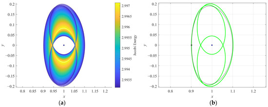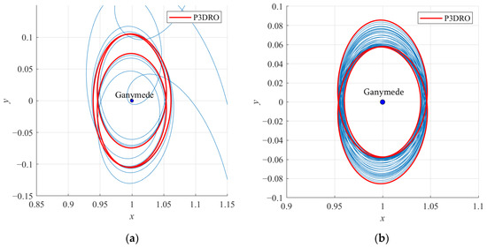 Orbits plotted in the Jupiter–Ganymede rotating frame: (a) P3DRO1 family and (b) P3DRO1 (X0 = [0.9010, 0, 0, 0, 0.19928, 0]T) and DRO (X0 = [0.9010, 0, 0, 0, 0.20722, 0]T) at x0 = 0.9010.