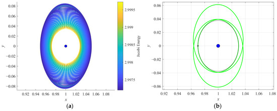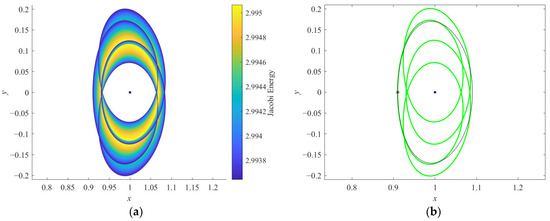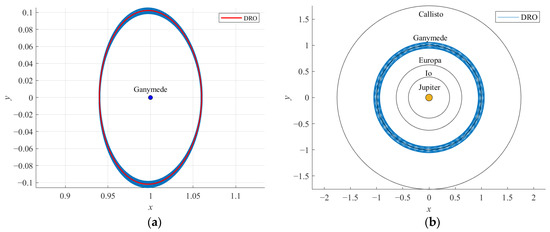 Orbits plotted in the Jupiter–Ganymede rotating frame: (a) P4DRO1 family and (b) P4DRO1 (X0 = [0.9100, 0, 0, 0, 0.18361, 0]T) and DRO (X0 = [0.9100, 0, 0, 0, 0.18905, 0]T) at x0 = 0.9100.