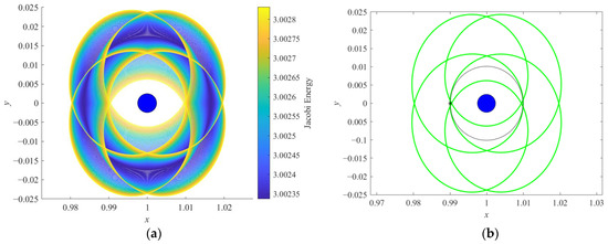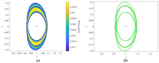 where ε is a sufficiently small real-valued number. The stable and unstable manifolds at this point can be computed by propagating the initial conditions forward and backward in time, respectively. Note that when dissipative forces are considered, the manifold obtained above needs to be modified in the initial value, or halfway, to achieve the transfer orbit between the target bodies. If we discretize the orbit into numerous points and repeat the steps above, then the stable and unstable manifold structures are obtained [36,37]. For orbits that have complex geometric configurations, such as period-multiplying orbits, drawing manifolds directly is detrimental to subsequent analysis; therefore, a Poincaré section is employed to delineate the manifold structures in this case.