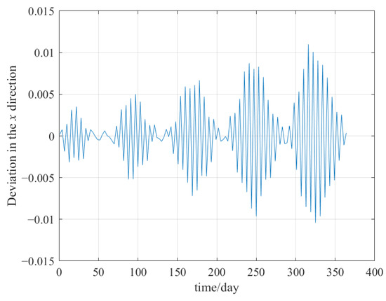 The initial condition X0 of a DRO can be calculated in the CR3BP system, then transformed to the inertial system and given the Galilean moons’ and the Sun’s initial phase angles θi0 (i = 1, 2, 3, 4) and θs0, respectively. The DRO affected by their gravitational perturbations can be obtained by propagating X0 forward. One example of perturbed DRO at X0 = [0.9400, 0, 0, 0, 0.13208, 0]T with θi0 = 0 and θs0 = 0 and a propagation time of 1 year is shown in Figure 19. The influence of the Sun’s gravity in the Jupiter system is very small, so the main perturbation influence comes from the other Galilean moons. Meanwhile, the investigated DRO is a considerable distance from the other Galilean moons, as shown in Figure 19b. Therefore, the perturbed DRO remains in a similar trajectory to the DRO, without any perturbation within the given propagation time. When this trajectory crosses the y = 0 plane, the position error in the x-direction is about ±0.0006, actually about ±600 km. The position errors between the perturbed and unperturbed DRO orbits in the x direction at different times are plotted, as shown in Figure 20. It shows that although the perturbed DRO orbit is stable around the original DRO orbit, the orbit position error shows an increasing trend. Therefore, it is still necessary to maintain the orbit in a timely manner.