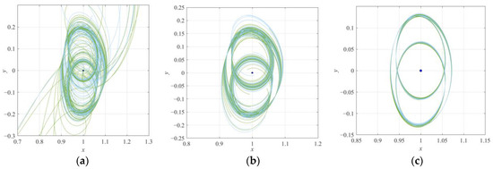 Stable manifold structures of P3DRO in two periods: (a) X0 = [0.9025, 0, 0, 0, 0.19642833, 0]T, νmax = 26.2387, (b) X0 = [0.9155, 0, 0, 0, 0.17223724, 0]T, νmax = 10.1016, and (c) X0 = [0.9295, 0, 0, 0, 0.14750765, 0]T, νmax = 3.0858.