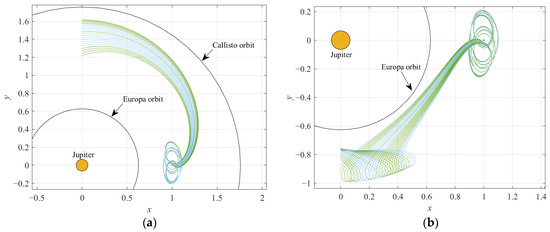 Furthermore, we investigated the manifold structures of engineering significance, the methodology for which is mentioned in Section 2.5. We selected a part of stable manifolds near the period-tripling bifurcation orbit (X0 = [0.9025, 0, 0, 0, 0.19642833, 0]T, J = 2.993305); the integration duration is three times that of the original orbital periods. We selected some points on the original orbit for integration, terminating when the orbits crossed the plane x = 0, and drew their stable manifolds. The initial point of integration is selected as the point on the orbit when the initial value of the original orbit runs for 1.4~1.7 days; their stable manifold structures are shown in Figure 23a. The initial point of integration was selected as the point on the orbit when the initial value of the original orbit runs for 11.0~11.4 days; their stable manifold structures are shown in Figure 23b. The manifolds of these parts of the orbit will come close to the orbit of Europa or Callisto after 20~30 days, so there is the possibility of a fast low-energy transfer between the Galilean moons.